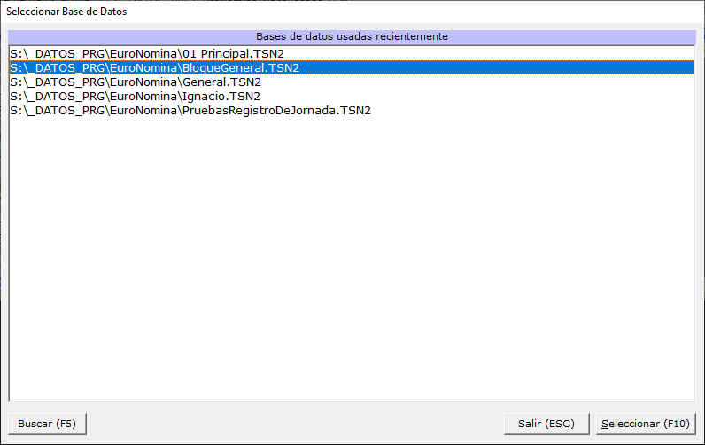 En la ventana central de esta pantalla se muestran las bases de datos usadas recientemente.