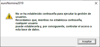 Si la base de datos actual no dispone de contraseña maestra para la administración de esta gestión de usuarios, el programa mostrará un mensaje advirtiendo