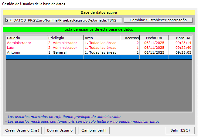 Borrar usuario , o bien pulse la tecla Supr. Se borrará el registro indicado de la tabla de usuarios,