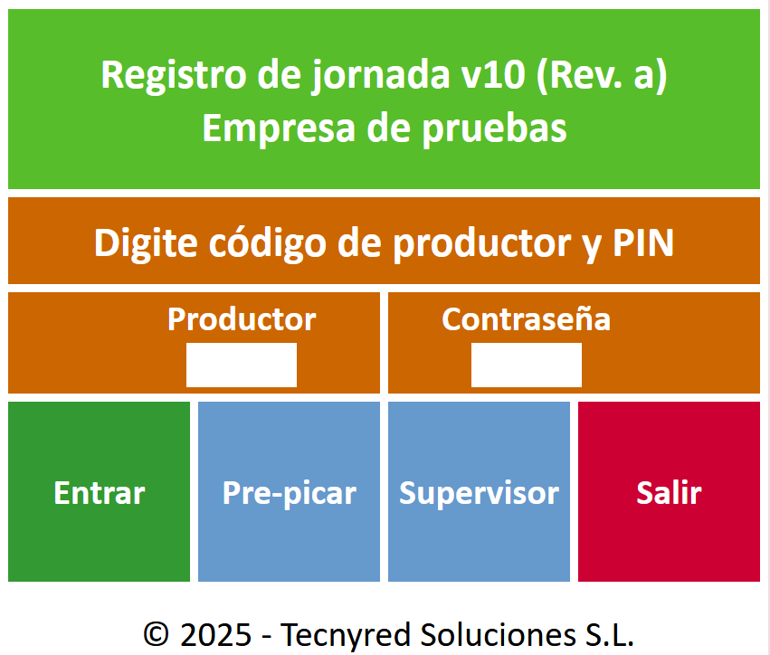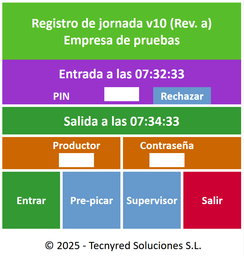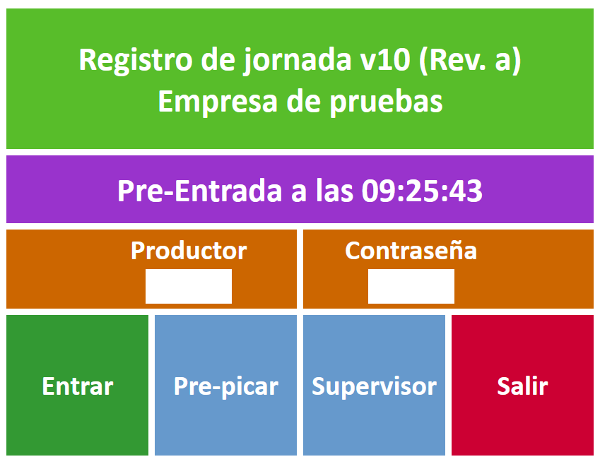 El uso general de esta pantalla es muy fácil: registrar la entrada y salida del puesto de trabajo. Un trabajador deberá identificarse para poder registrar